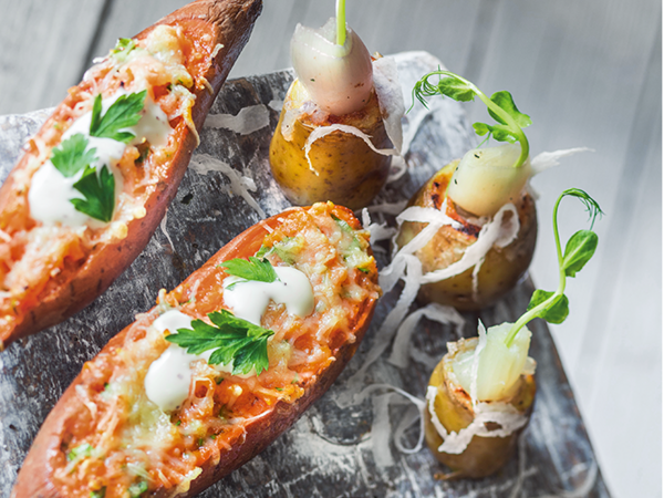 3. Den Lardo sehr klein würfeln und in die ausgehöhlten Kartoffeln füllen. Die Schalotten vom Grill nehmen, die Wurzelseite abschneiden und den weichen Kern herausdrücken. Mit der oberen, spitzen Seite in den Lardo stecken. Die Kartoffeln mit je einem Erbssprossenstängel garnieren und ein paar Tropfen warmen Zitronensaft darüberträufeln.